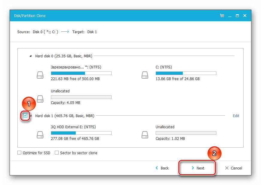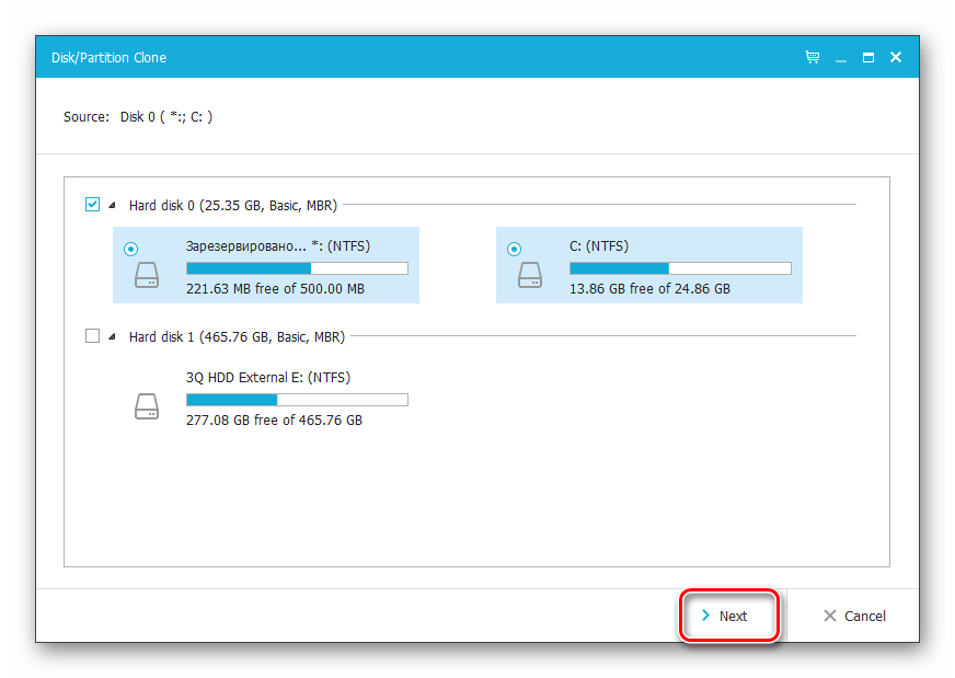 Вы можете снимать выделение с тех разделов, которые клонировать не нужно (при условии, что вы в этом уверены). После выбора нажмите на кнопку «Next».