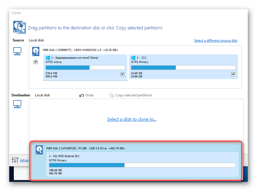Перейдя в раздел Disk Clone, можно выбрать раздел, который предполагается клонировать, и накопитель, на который он будет переноситься.