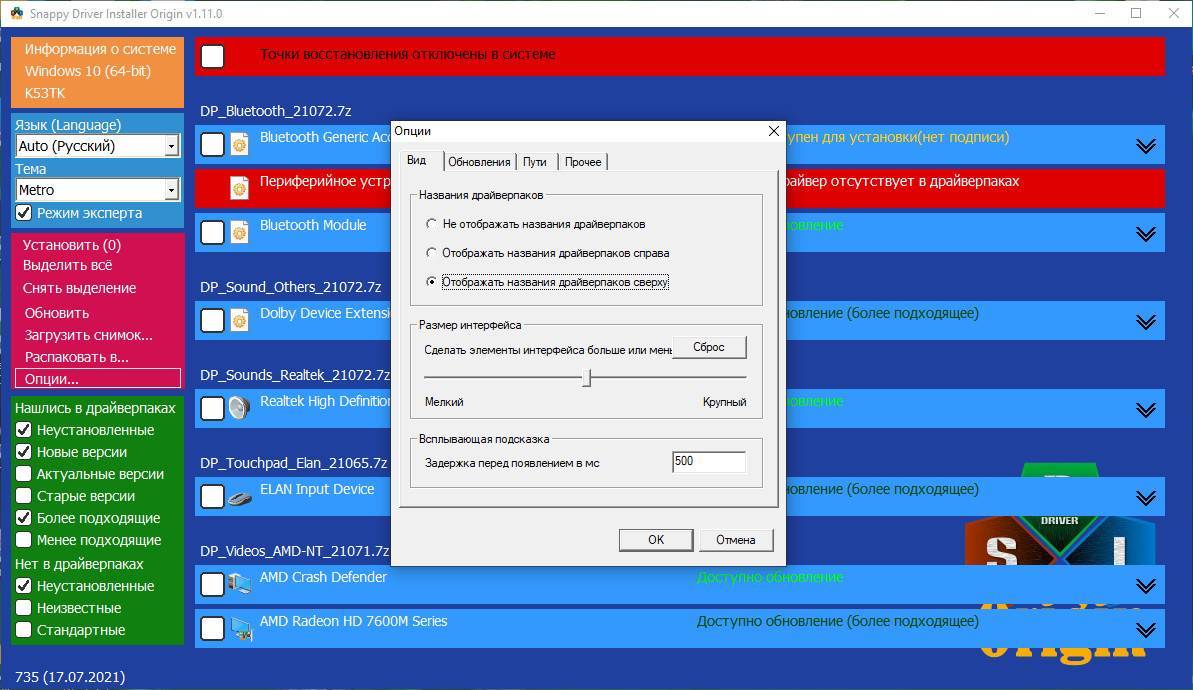 Интерфейс Snappy Driver Installer
