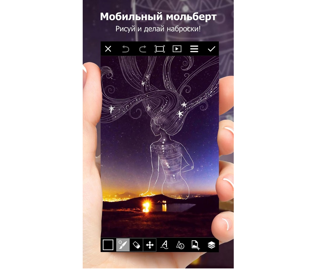 - Мобильный мольберт. Пользователь может делать полноценные рисунки или же просто наброски для дальнейшей их обработки. С помощью того набора опций, который есть в приложении, можно сделать действительно красивые рисунки. Кроме всего прочего, линии здесь получаются не кривыми, а прямыми или округленными – все зависит от фона и рисунка.