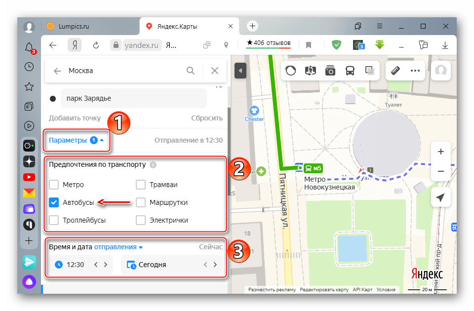 Система покажет все подходящие виды транспорта. Если интересует какой-то определенный, например, маршрут автобусов, открываем вкладку параметры и выбираем тип транспорта. Также можно задать дату и время отправления или прибытия.