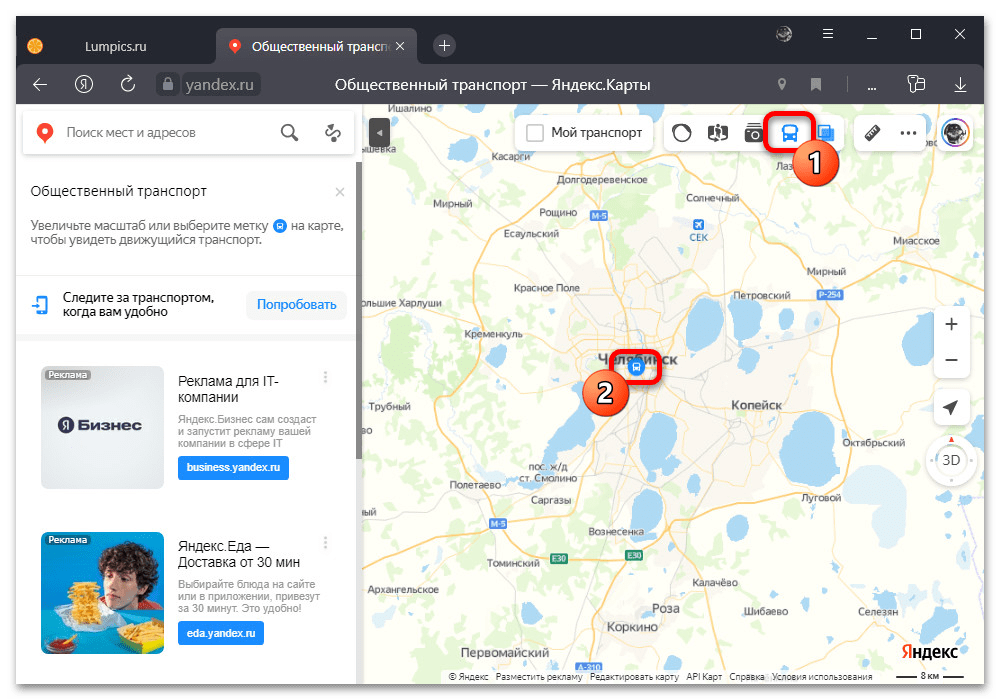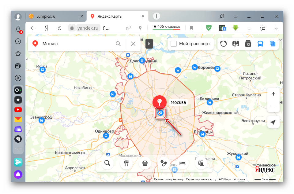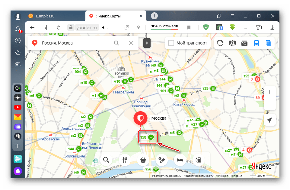 При отсутствии указанных значков следует отдалить карту и щелкнуть по иконке транспорта, как показано на представленном ниже скриншоте. В этом случае карта автоматически приблизится на достаточную дистанцию для просмотра движущегося транспорта.