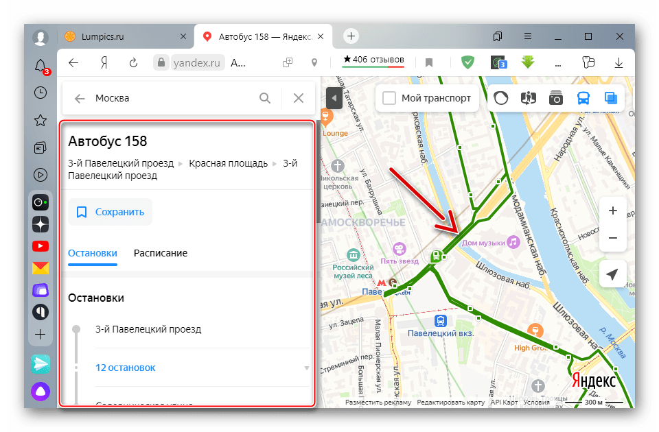 Сервис также может запоминать часто используемые маршруты. Для этого область слева прокручиваем в самый верх и жмем «Сохранить».