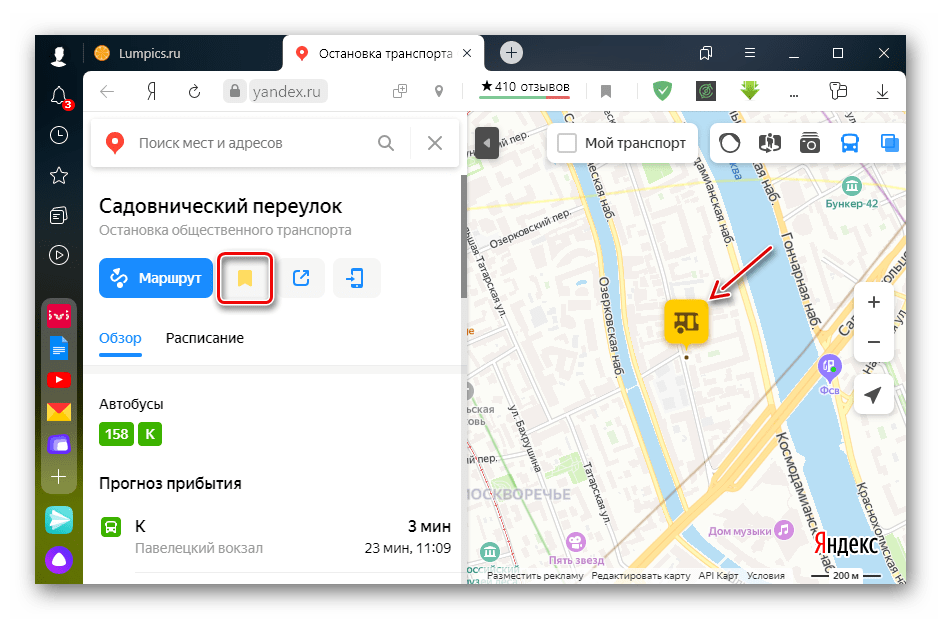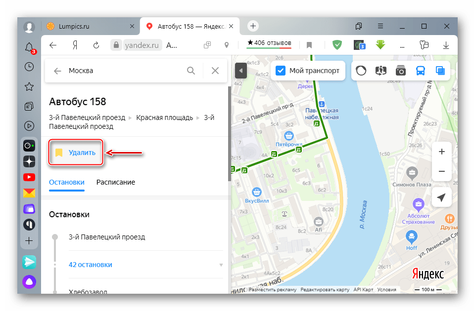 Любую остановку можно сохранить, щелкнув соответствующую иконку. С этого момента она будет обозначаться на карте желтым цветом и отображаться, даже если выключена функция «Движущийся транспорт».