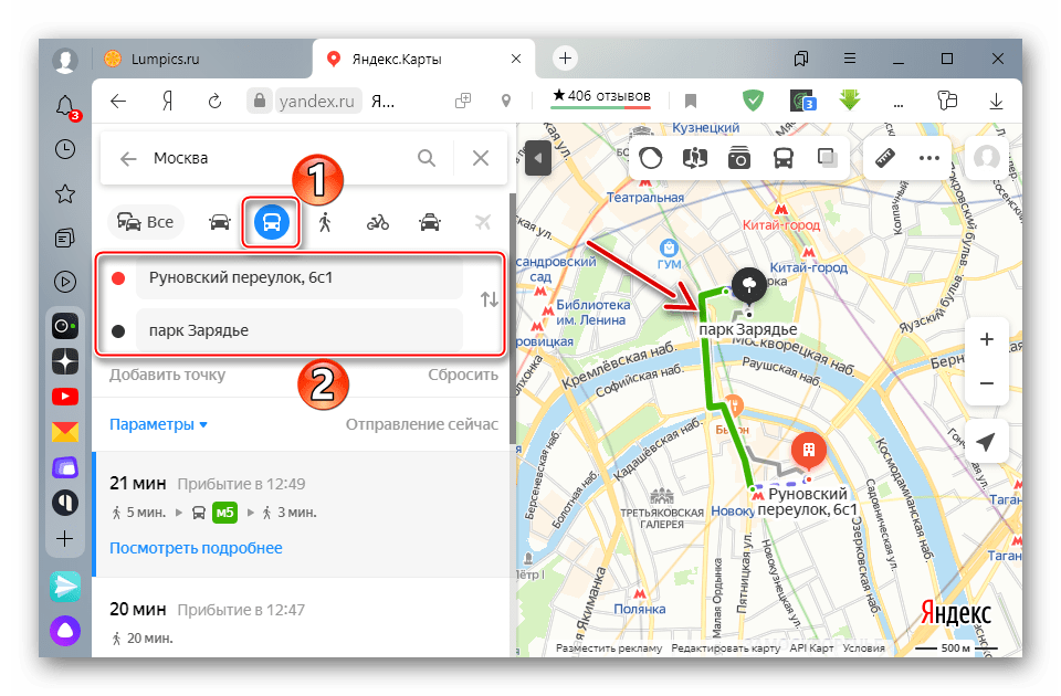 Переходим во вкладку «Транспорт», в верхней области указываем свое местоположение, а в нижней – пункт назначения. Справа на карте появится схема маршрута.