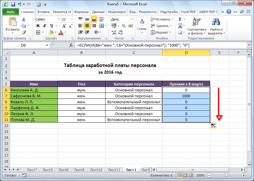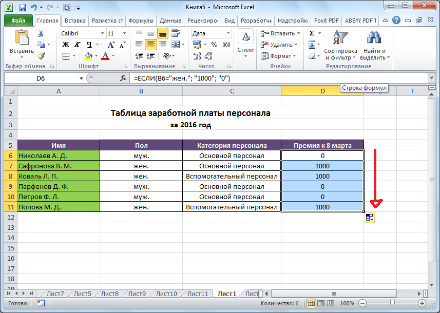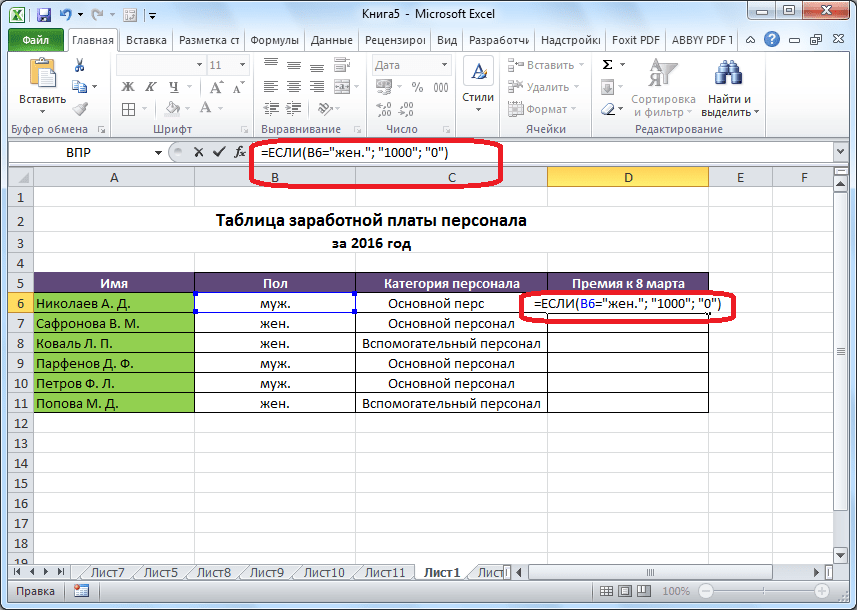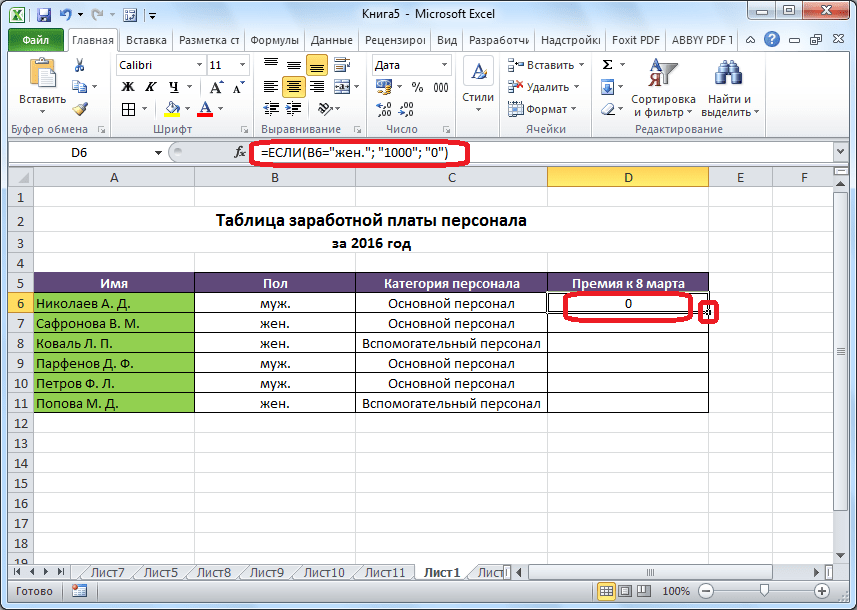 - Имеем таблицу заработной платы. Всем женщинам положена премия к 8 марту в 1000 рублей. В таблице есть колонка, где указан пол сотрудников. Таким образом, нам нужно вычислить женщин из предоставленного списка и в соответствующих строках колонки «Премия к 8 марта» вписать по «1000». В то же время, если пол не будет соответствовать женскому, значение таких строк должно соответствовать «0». Функция примет такой вид: «ЕСЛИ(B6=»жен.»; «1000»; «0»)» . То есть когда результатом проверки будет «истина» (если окажется, что строку данных занимает женщина с параметром «жен.»), то выполнится первое условие — «1000», а если «ложь» (любое другое значение, кроме «жен.»), то соответственно, последнее — «0».
