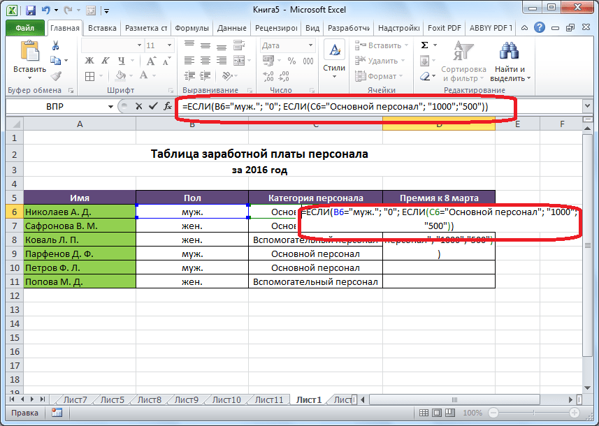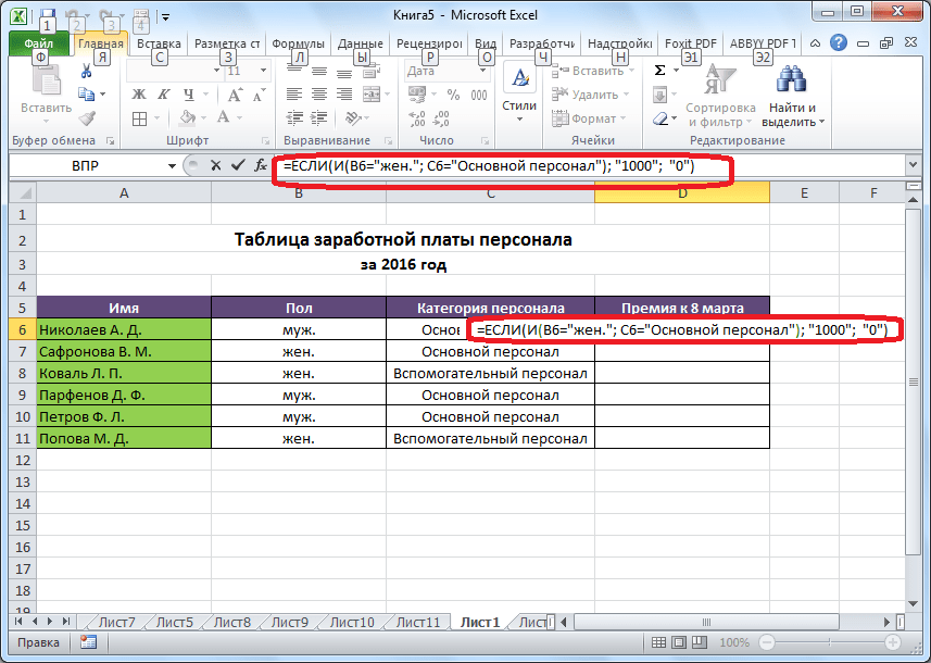 - Для примера возьмем все ту же таблицу с выплатами премии к 8 марта. Но на этот раз, согласно условиям, размер премии зависит от категории работника. Женщины, имеющие статус основного персонала, получают бонус по 1000 рублей, а вспомогательный персонал получает только 500 рублей. Естественно, что мужчинам этот вид выплат вообще не положен независимо от категории.