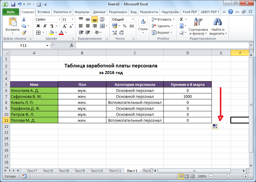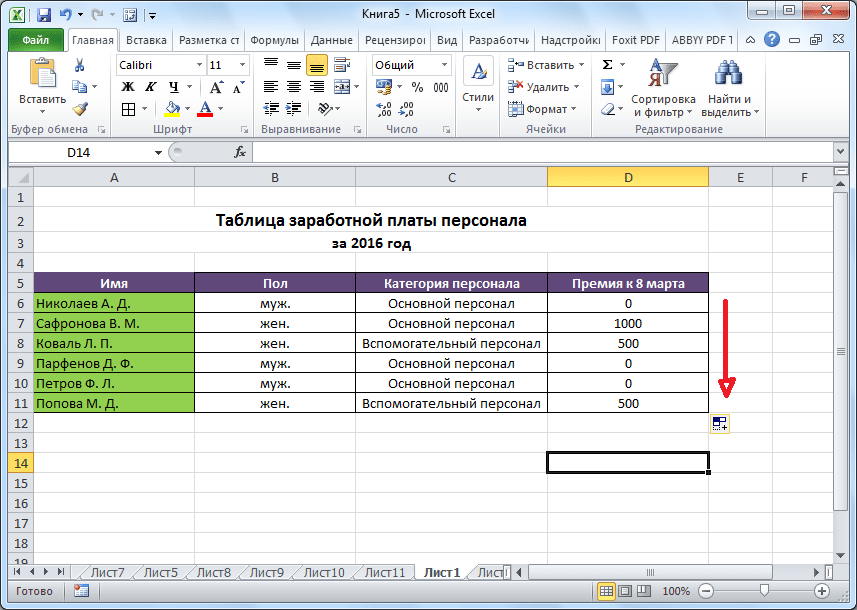 Чтобы рассчитать премию для всех сотрудников, воспользуемся Маркером заполнения. Наведем курсор на правый нижний угол ячейки с формулой. После того, как курсор примет форму черного крестика (это и есть Маркер заполнения), зажимаем левую кнопку мыши и протягиваем выделение вниз, до последней ячейки столбца.