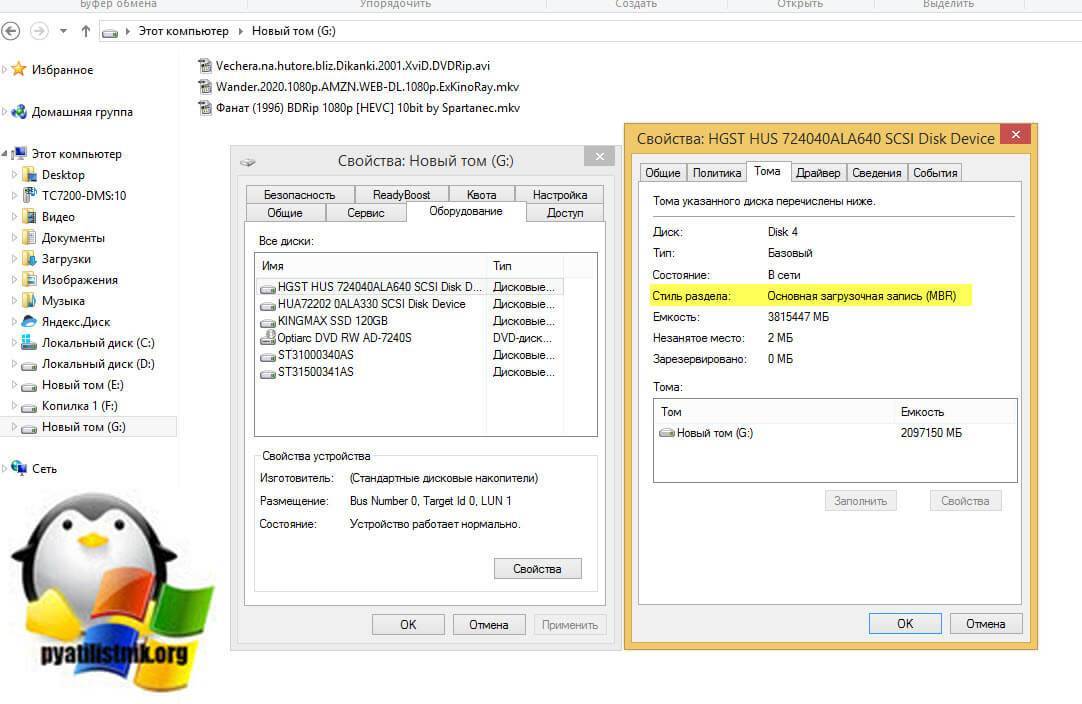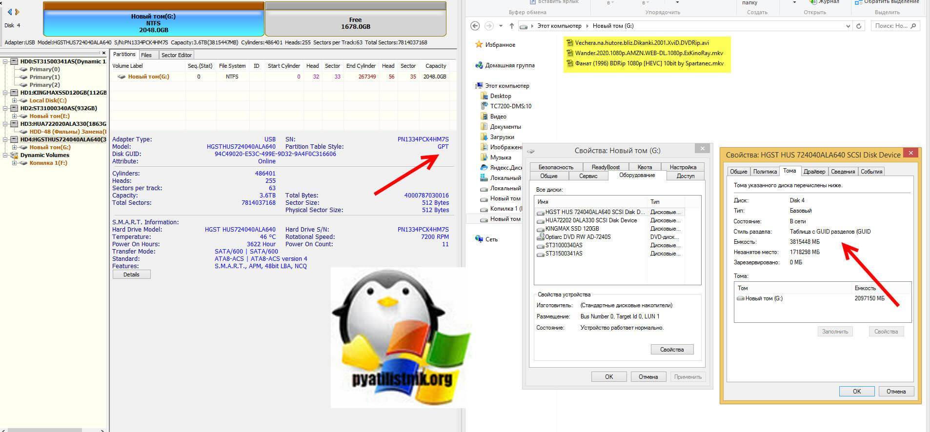 У меня уже есть мой размеченный HGST диск, размером 4 ТБ, на нем я создал раздел и положил несколько фильмов, для проверки целостности данных.
