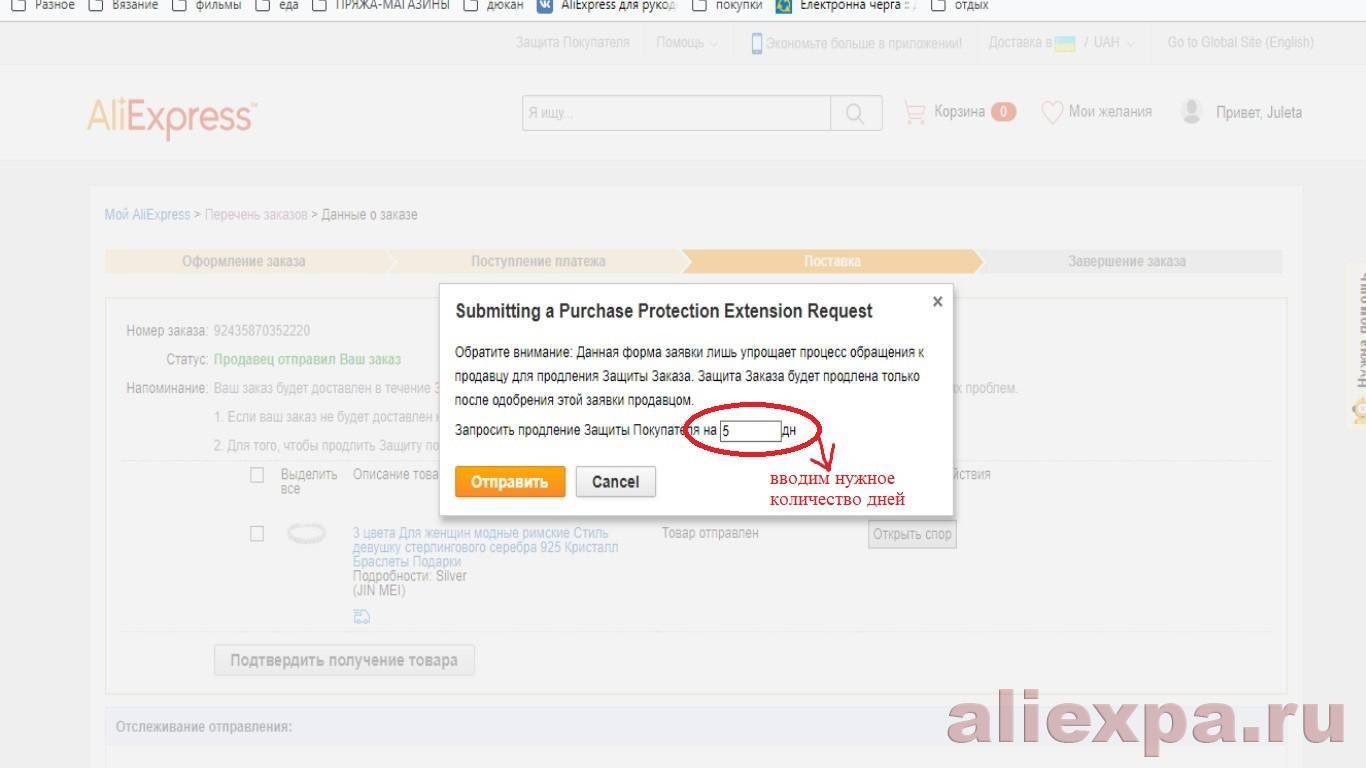 Иногда случаются такие ситуации, когда срок гарантированной защиты покупателя на виртуальной площадке AliExpress истек, а товара все нет, что клиенту делать. Сразу необходимо послать уведомление с просьбой о продлении периода продолжительности.