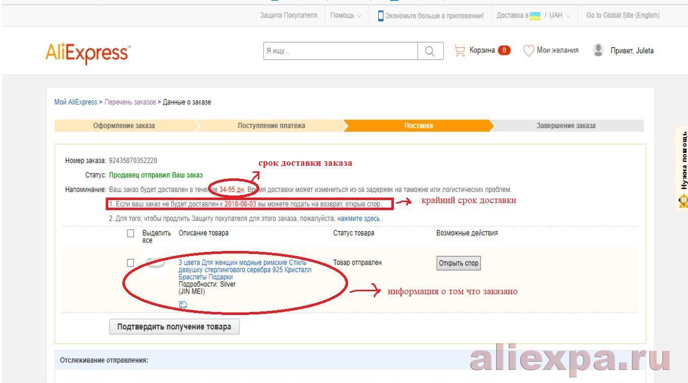 Здесь найдете информация о номере заказа и том, что было заказано. Также есть напоминание за какой период времени товар будет доставлен к Вам. В данном примере за 34-55 дней – конечная дата доставки 3 августа (2018-08-03). Именно к этому времени срок защиты истекает. В случае не получения заказа, то можно либо продлить «защиту покупателя», либо же открыть «спор».