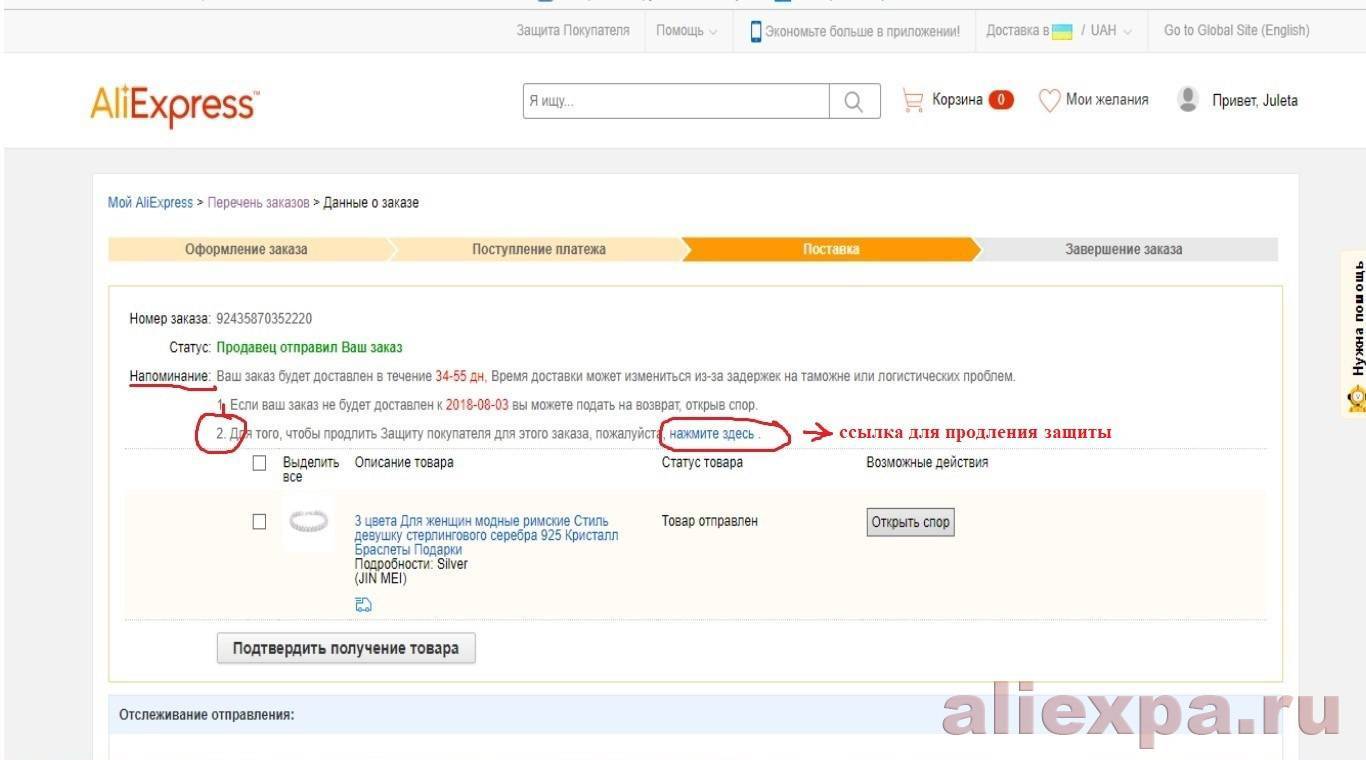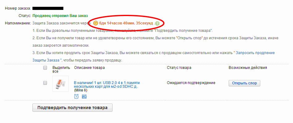 Внимание: Если заказ не был доставлен вовремя и продавец подтвердил отправку, вы можете продлить время Защиты покупателя.