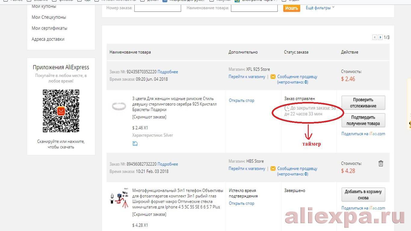 Открываем сайт Алиэкспресс в сети интернет, попадаем в свой личный кабинет, заранее пройдя авторизацию. В разделе «Мои заказы» кликаем нужный, сразу же видим, сколько дней до завершения защиты, кликаем «подробнее» и переходим к следующему пункту.