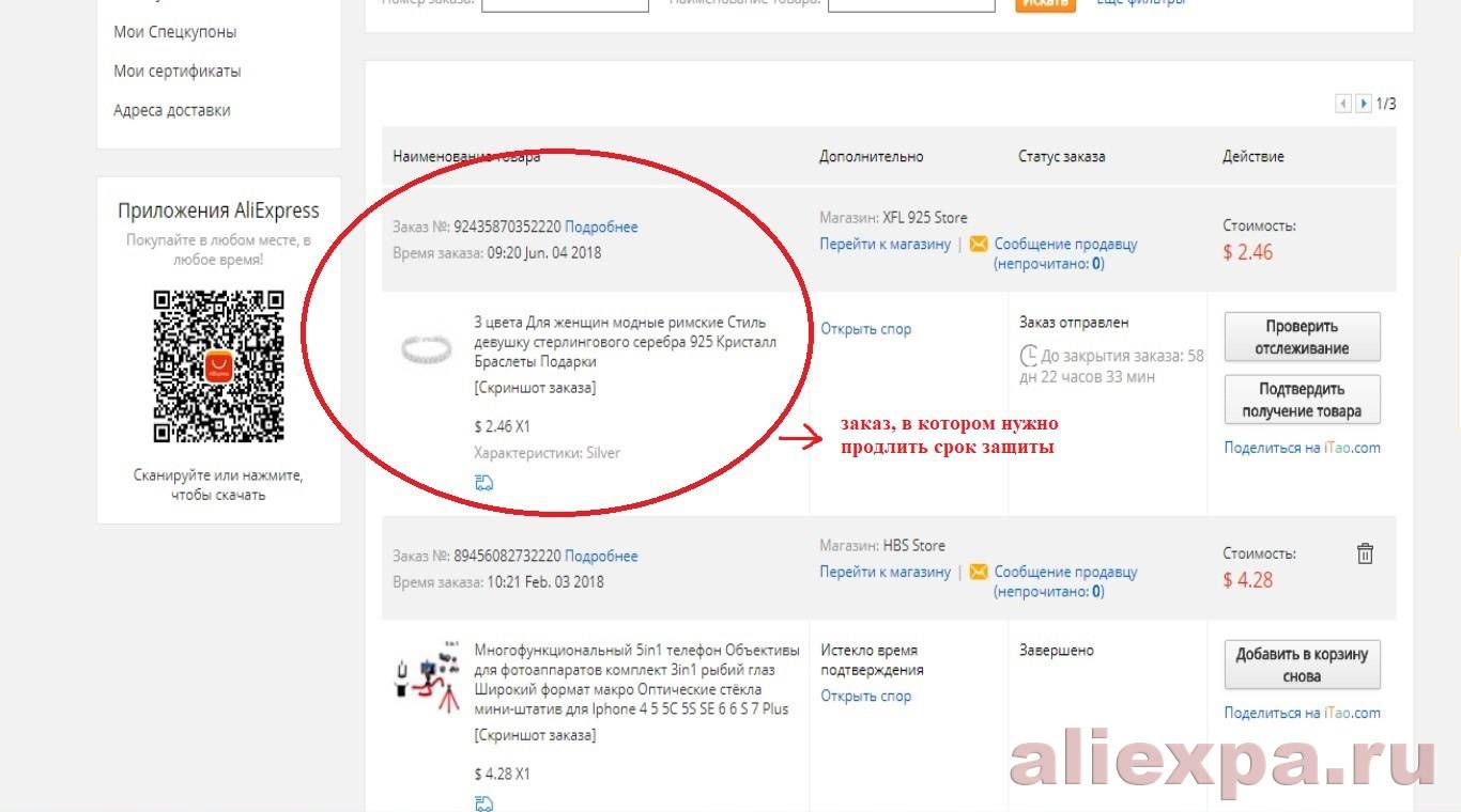 Как продлить защиту заказа на Алиэкспресс в мобильном приложении?