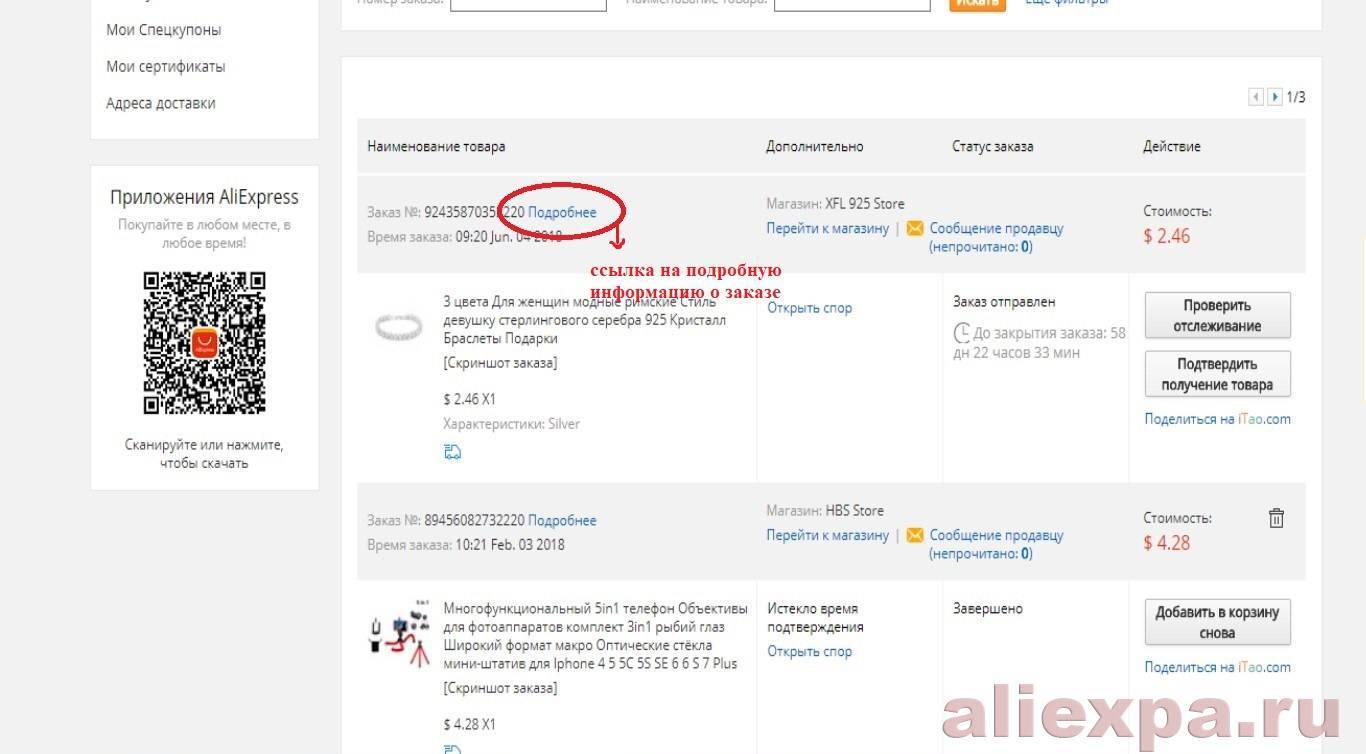Возле номера заказа нажимаем на надпись: «Подробнее», которая подсвечивается синим цветом.