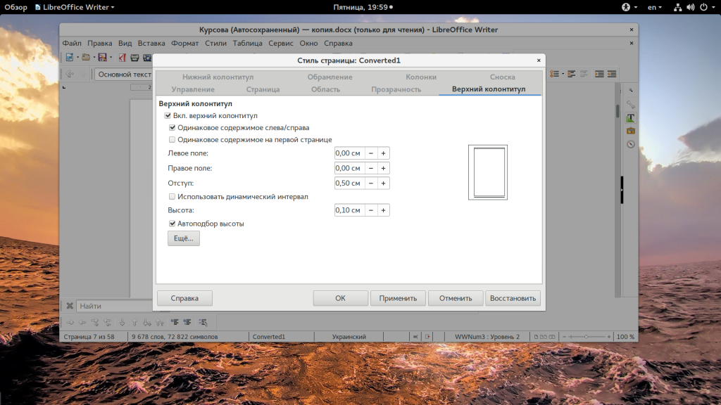 Настройка колонтитулов осуществляется через меню «Формат → Страница» во вкладках «Верхний колонтитул» и «Нижний колонтитул». Можно задать высоту колонтитула, интервалы и внешнее оформление.
