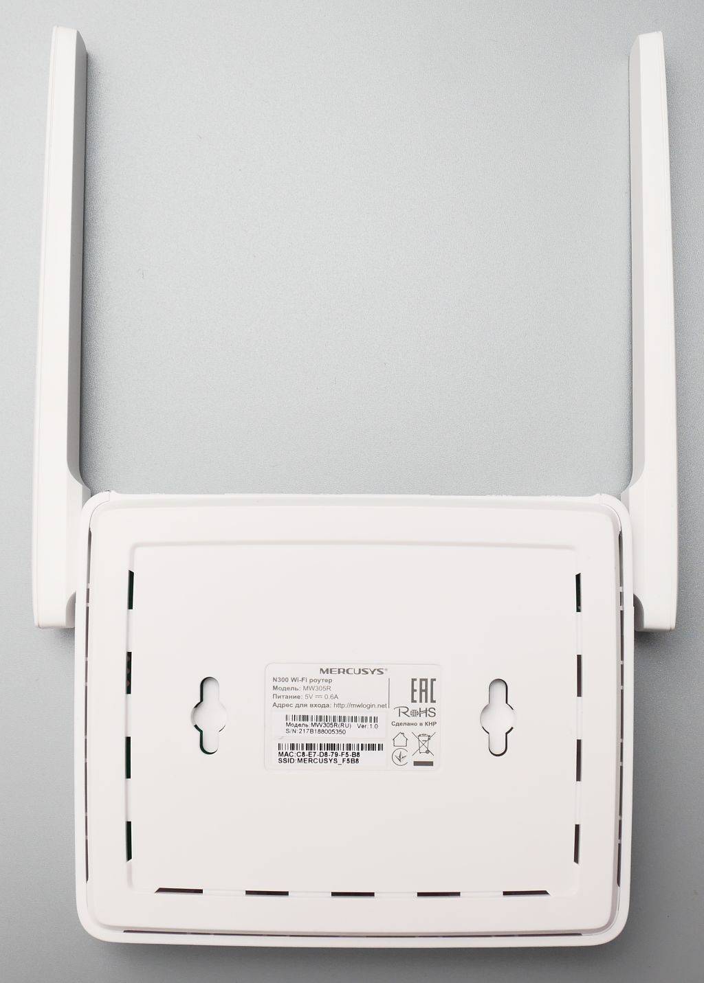 А вот из плюсов – две поворотные антенны (правда, поворотные только в одной плоскости и всего на 180 градусов) по бокам с коэффициентом усилением 5 дБи (обычно у бюджетных роутеров используются антенны с усилением 3 дБи), но что касается реальной мощности беспроводного сигнала – его мы непременно замерим чуть позже. Антенны несъёмные, но это стандартная ситуация для недорогого роутера. Также к плюсам стоит отнести возможность крепления на стену (правда, только в вариантах: «порты вниз» и «порты вверх»), в остальном же – всё вполне типично для своего ценового диапазона. Например, однодиапазонный Wi-Fi с максимальной скоростью соединения 300 Мбит/с.