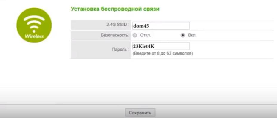 Переходим к нижнему разделу «Установка беспроводной связи». Здесь придумайте новое имя для своей домашней сети Wi-Fi и вместо password задайте свой пароль и нажмите кнопку «Сохранить». Это имя и пароль лучше записать, так как в ближайшем будущем и в дальнейшем с их помощью вы будете подключать к роутеру домашние устройства. После этого интернет должен заработать. Убедитесь в этом, открыв любую поисковую систему или какую-либо другую веб-страницу в браузере.