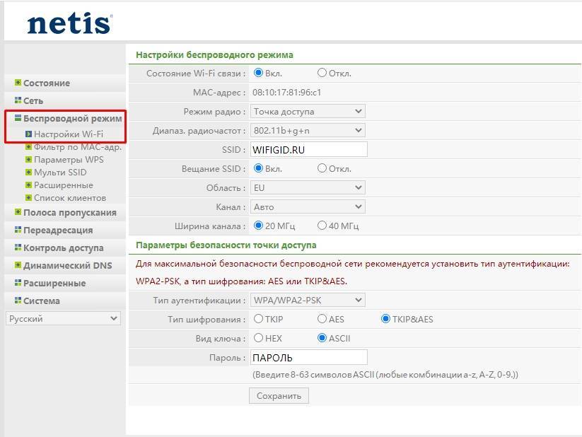 Или можно установить тоже самое в разделе «Advanced» – «Беспроводной режим» – «Настройки Wi-Fi».
