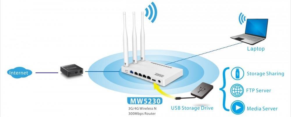 Вторая особенность — работа с подключаемыми съёмными носителями. Вы всегда можете подключить по USB внешний жесткий диск и организовать файловый сервер в локальной сети, удалённый доступ из Интернета по FTP, либо поднять домашний медиасервер и смотреть видео с устройств домашней сети. Этот во многом функционал будет интересен при использовании netis MW5230 в офисе небольшой фирмы, чтобы не держать отдельно файловый сервер.
