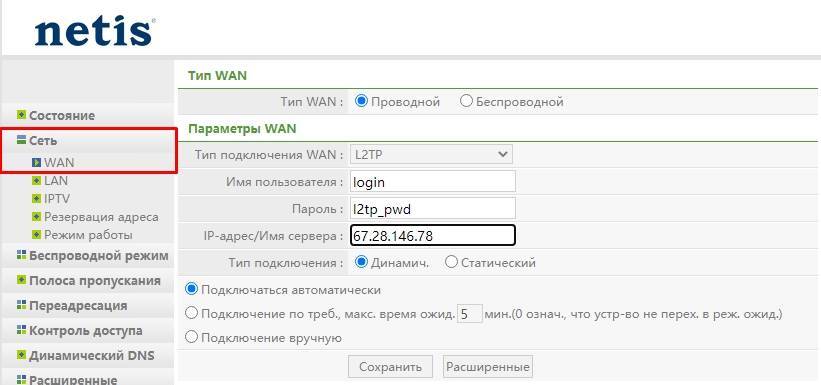 Переходим в «Advanced» – «Сеть» – «WAN». Устанавливаем нужный нам тип подключения, вводим имя пользователя и пароль с договора, и не забываем указать адрес сервера. Указываем «Тип подключения» как «Динамический». Если же у вас статический IP адрес, то указываем второй вариант и заполняем все нужные строки.