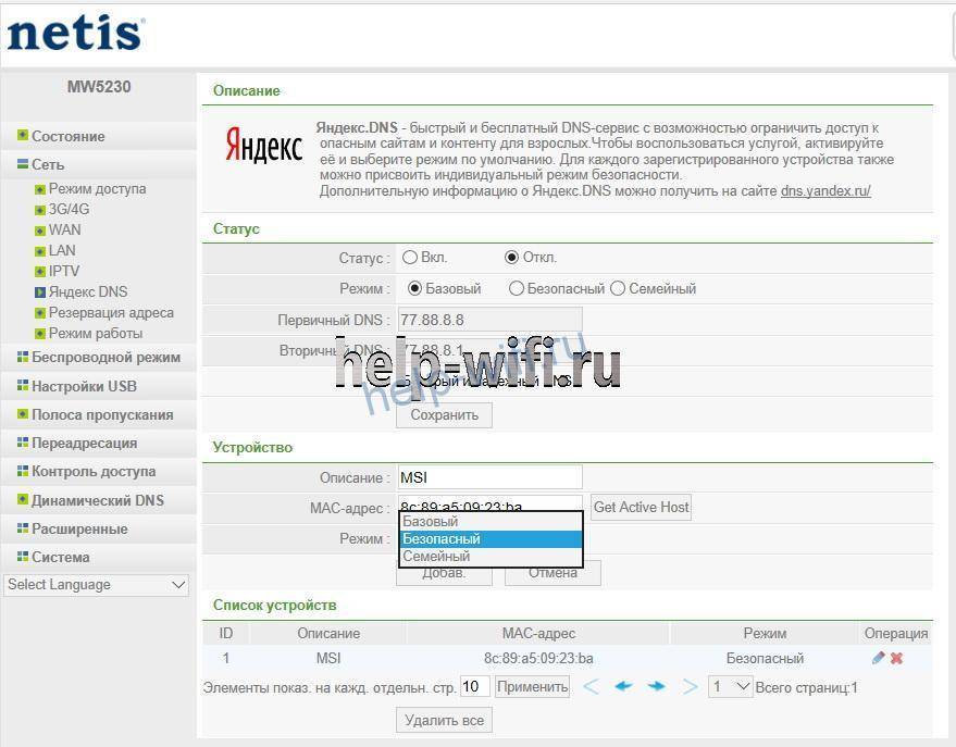 Для дополнительной защиты можно активировать DNS от Яндекса. Доступ к сервису предоставляется бесплатно. Доступно несколько режимов настройки Яндекс.DNS: базовый, безопасный, семейный. Один из плюсов роутера – возможность настроить DNS для каждого подключенного устройства отдельно.
