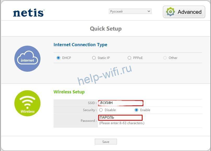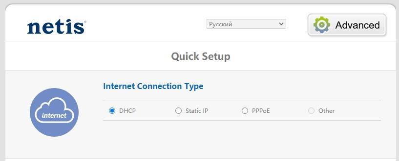 Особенностью роутера netis MW5230 является то, что при изобилии кнопок у него очень простая базовая настройка интернета, буквально в один шаг. Чтобы выполнить ее, откройте на подключенном к роутеру ноутбуке адрес, который указан на этикетке вашего роутера. Обычно для роутеров этого бренда это https://netis.cc или 192.168.1.1. Так как в этом роутере нет пароля для входа в панель управления, то вы сразу попадете на главную страницу настроек. Посмотрим, как ее заполнить.
