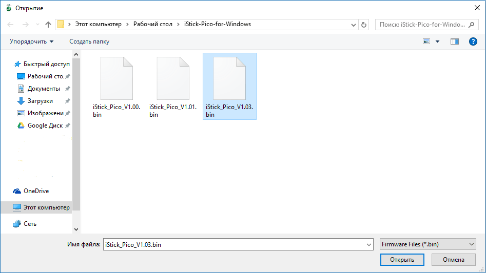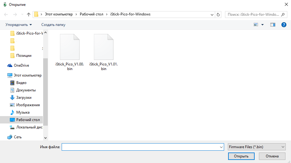 - Выбрать, ранее распакованный файл iStick_Pico_V1.01.bin и нажать кнопку Открыть