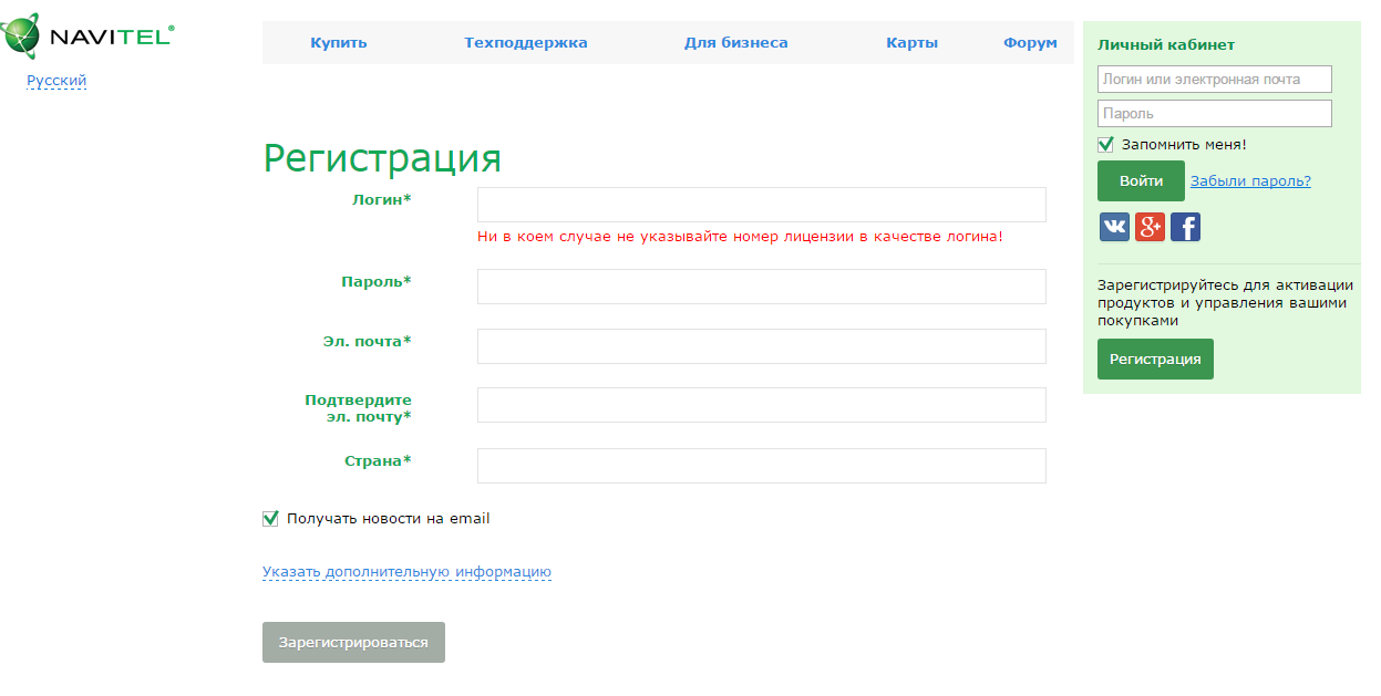 Регистрация на официальном сайте Навител