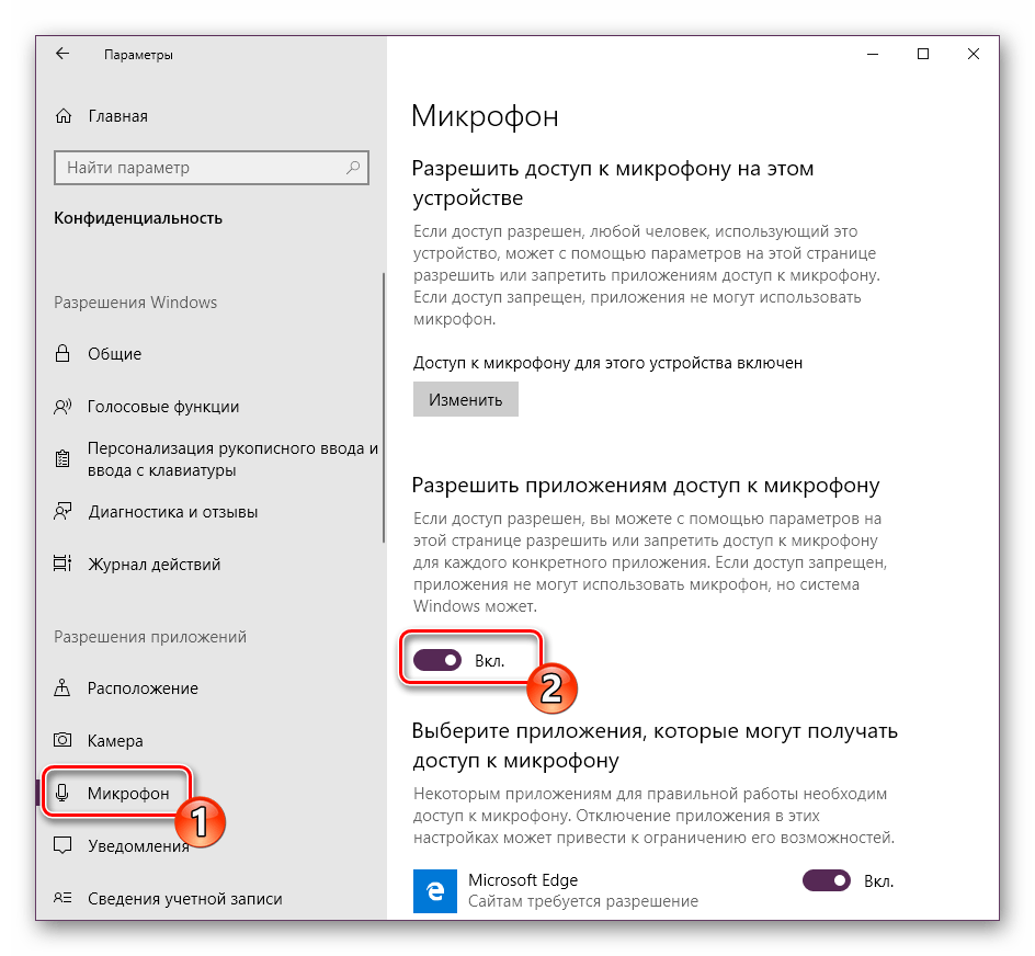 Опуститесь в раздел «Разрешения приложений» и выберите «Микрофон». Убедитесь в том, что активирован ползунок параметра «Разрешить приложениям доступ к микрофону».</li>