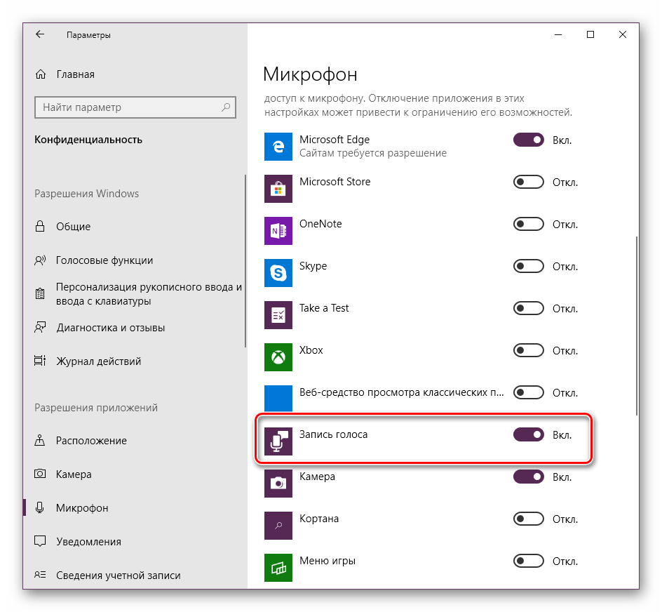 - В самом начале статьи мы привели инструкцию по предоставлению разрешений для микрофона. Вам следует вернуться туда и убедиться, что «Запись голоса» может использовать это оборудование.
