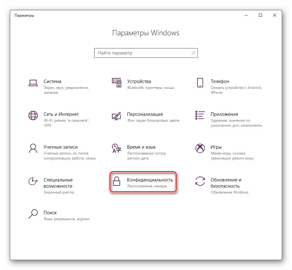 В открывшемся окне выберите раздел «Конфиденциальность».</li>