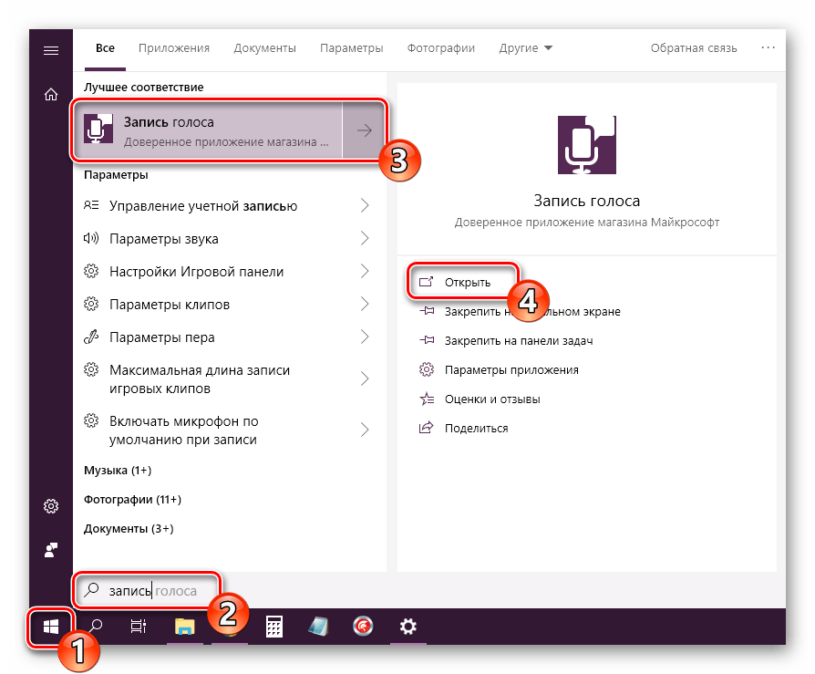 Далее откройте «Пуск» и через поиск найдите «Запись голоса».</li>