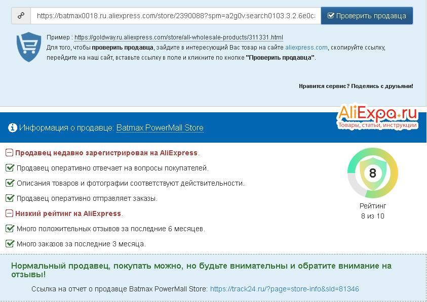 При нажатии кнопки «Проверить продавца» появится окошко с информацией о нем и рекомендациями по работе: