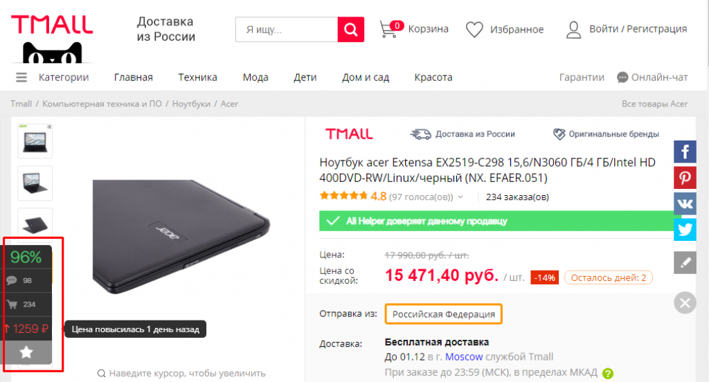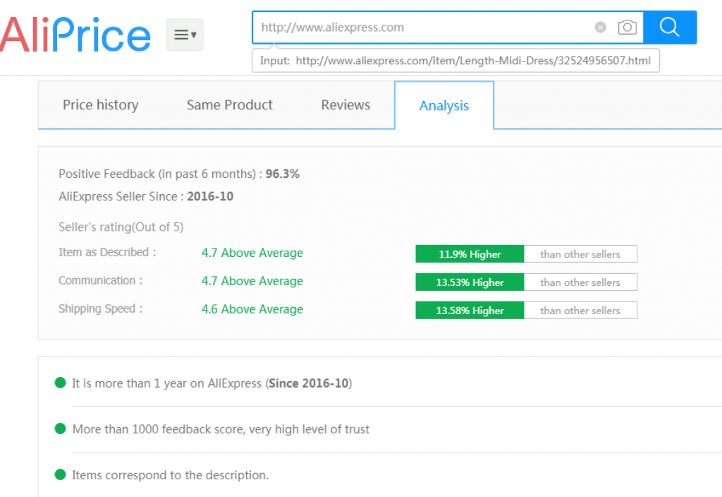 Это расширение для алиэкспресс доступно для таких браузеров, как Firefox, Yandex, Chrome, Opera. Помимо рейтинга продавцов, там можно найти историю расценок, поиск по фотографиям и многое другое. После того как будет установлено расширение, к каждому предмету будут появляться окна с подробной информацией на русском языке.