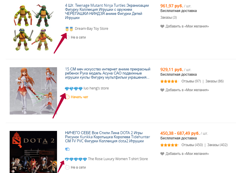 Остался еще один момент в характеристике продавцов. Если вы заметили, то напротив названия каждого магазина стоят значки. Короны, медали, алмазы. Это тоже формирует рейтинговую шкалу.