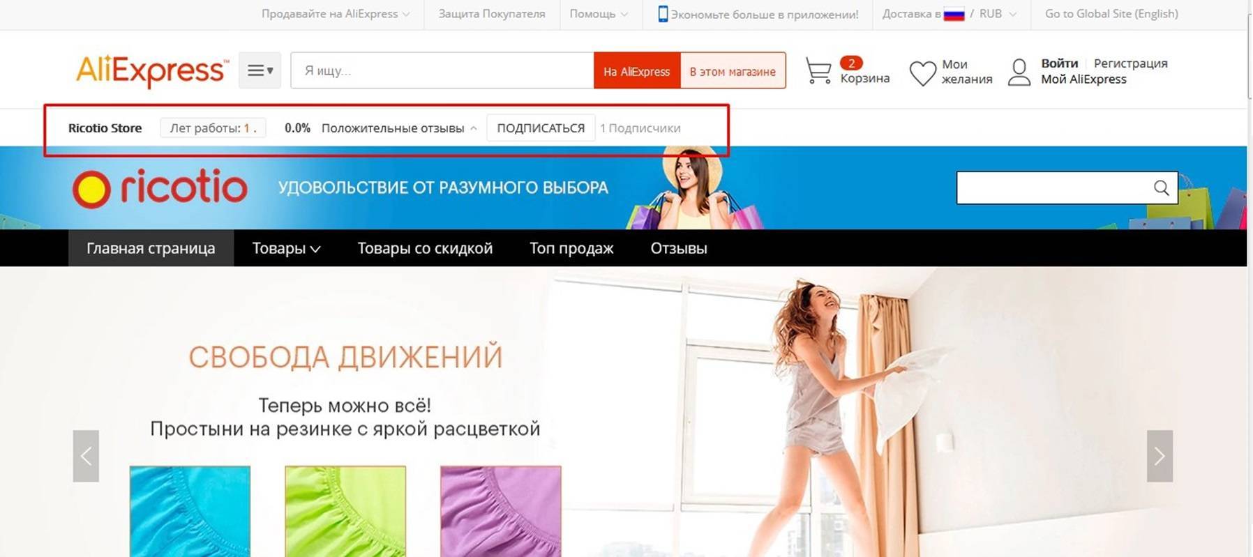 Найти характеристику продавца вы можете в двух местах на странице с товаром. Над главной фотографией есть название магазина, процент положительных отзывов и знаки в виде медалей, алмазов. Кликнув по этой строке, вы можете ознакомиться с детальной информацией о продавце.