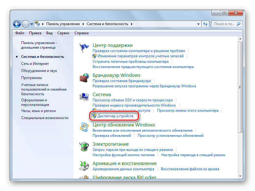 Далее в разделе «Система» отыщите пункт «Диспетчер устройств» и щелкните по нему.