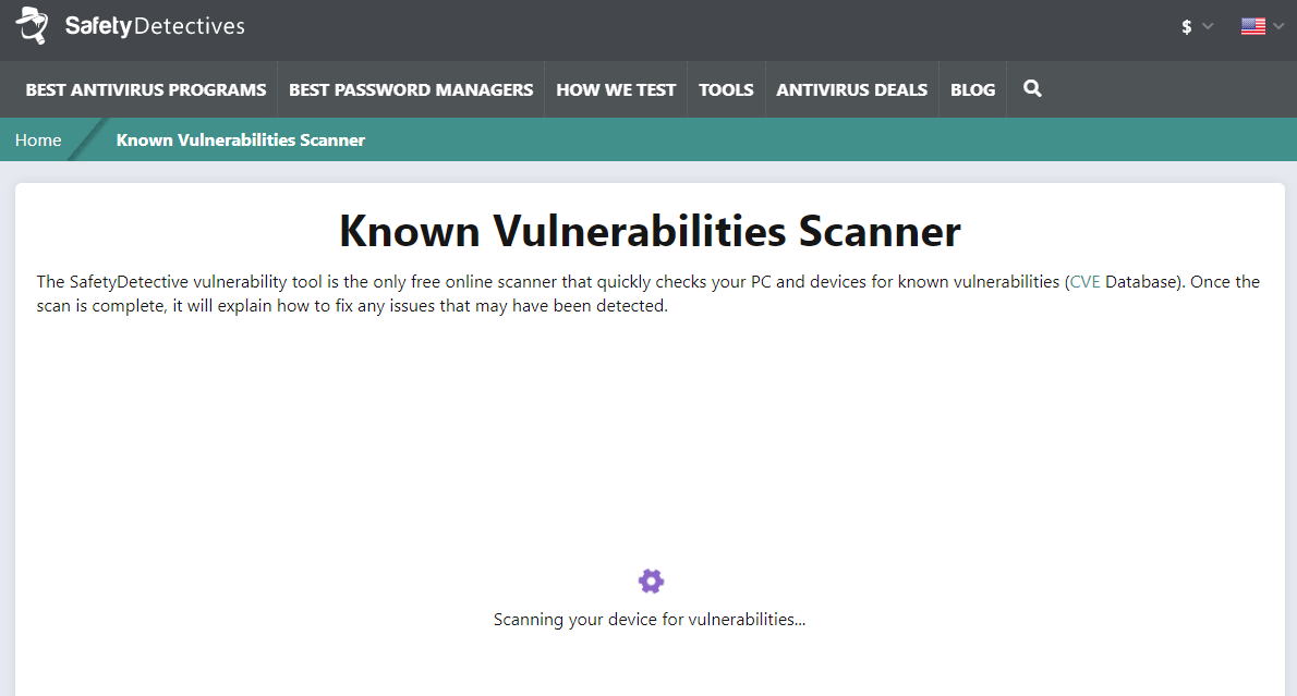 Данный инструмент полностью размещен на сайте SafetyDetectives, поэтому вам не нужно ничего скачивать, а сама проверка занимает несколько секунд. Большинство хакеров используют для взлома устаревшие системы – Поиск известных уязвимостей проследит за тем, что вы максимально защищены, при этом вам не нужно ничего скачивать (хотя вам обязательно следует установить антивирус).