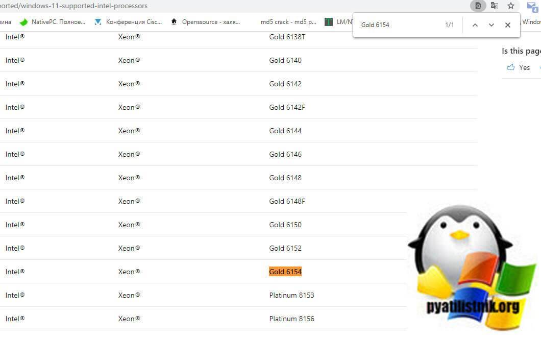 Выше я уже отмечал, что даже если у вас двухядерный 64-х разрядный процессор с частотой 1 ГГц и выше, нет никакой гарантии, что на ваш компьютер получится установить одиннадцатую винду. На сайте Microsoft есть перечень CPU, совместимых с Win 11.