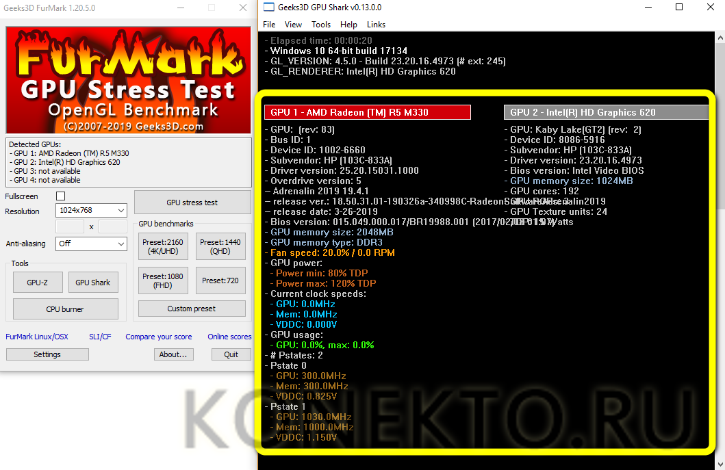 Данная программа не только содержит встроенную утилиту GPU-Z, но и позволяет нагрузить адаптер, провести его стресс-тест на критических нагрузках. При любых неполадках в виде сбоев видеопамяти или шины передачи данных из-за плохого контакта, FurMark позволит определить неисправность.