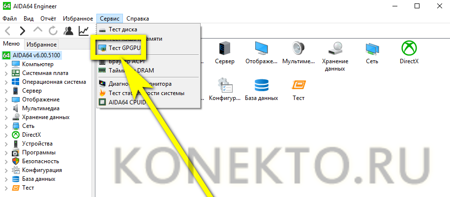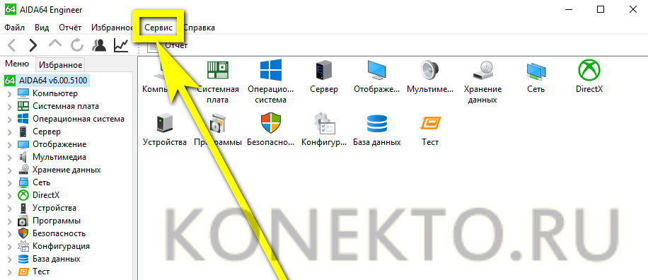 Скачать (ссылка — aida64russia.com) и запустить приложение, открыть выпадающее меню «Сервис».