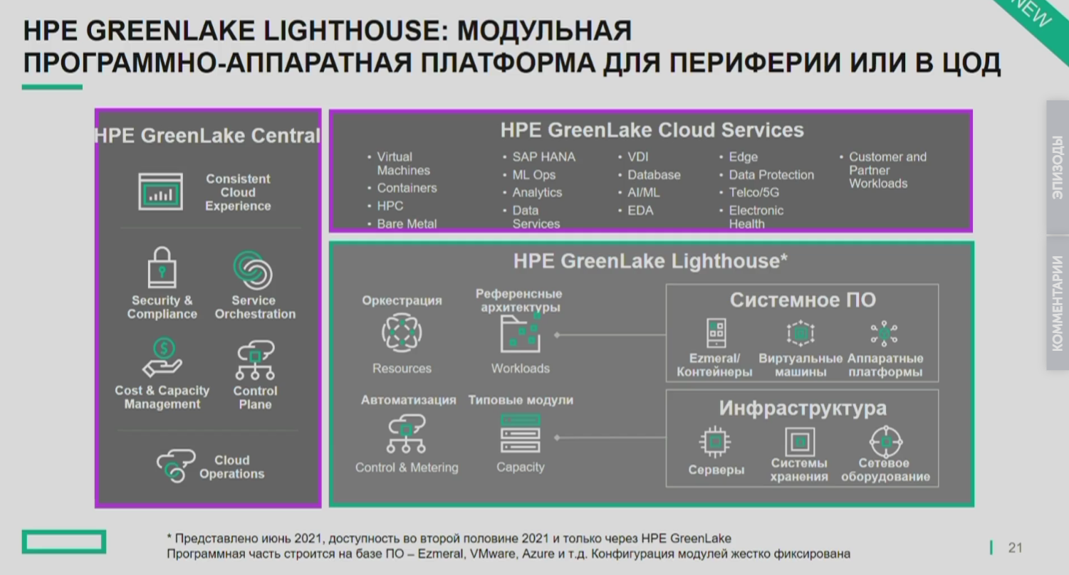 Также HPE презентовала облачную операционную консоль управления серверами Compute Cloud Console, новое поколение систем хранения с управлением через облачную консоль (Data Services Cloud Console) Alletra и модульную программно-аппаратную платформу для построения облака, расположенного в собственном ЦОД GreenLake LightHouse компании.