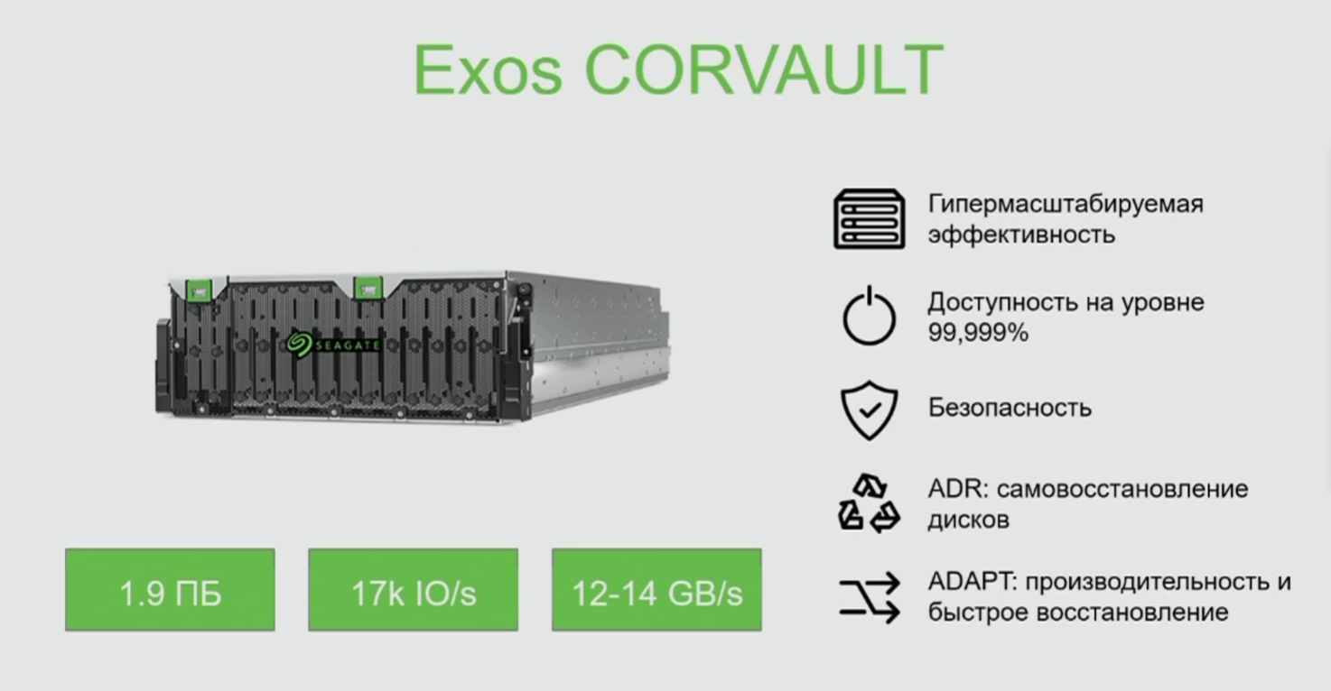 Алексей Чернышов, presale-инженер Seagate, привел данные компании, согласно которым, к 2025 году в мире будет генерироваться 175 зеттабайт (10²¹ байт) данных в год. Он презентовал новый продукт Seagate — Corvault, умную систему хранения данных, которая способна сама восстанавливать их при сбоях благодаря умному распределению информации внутри хранилища.