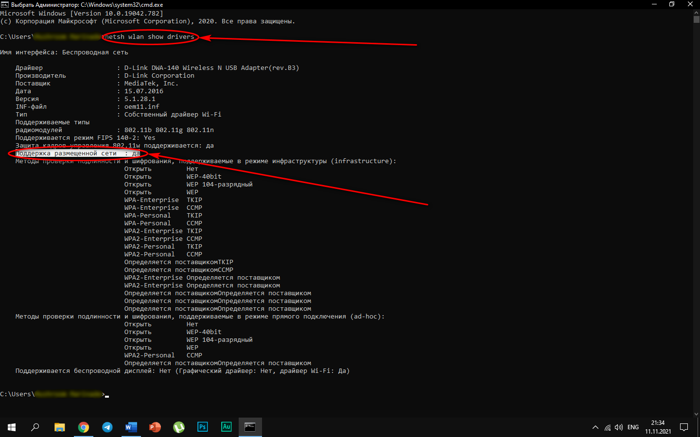 В консоли сразу же выполняем команду netsh wlan show drivers дабы удостовериться, что в текущий момент Wi-Fi адаптер ноутбука способен работать в режиме точки доступа. После ввода указанной команды жмем Enter и ищем строку «Поддержка размещенной сети».