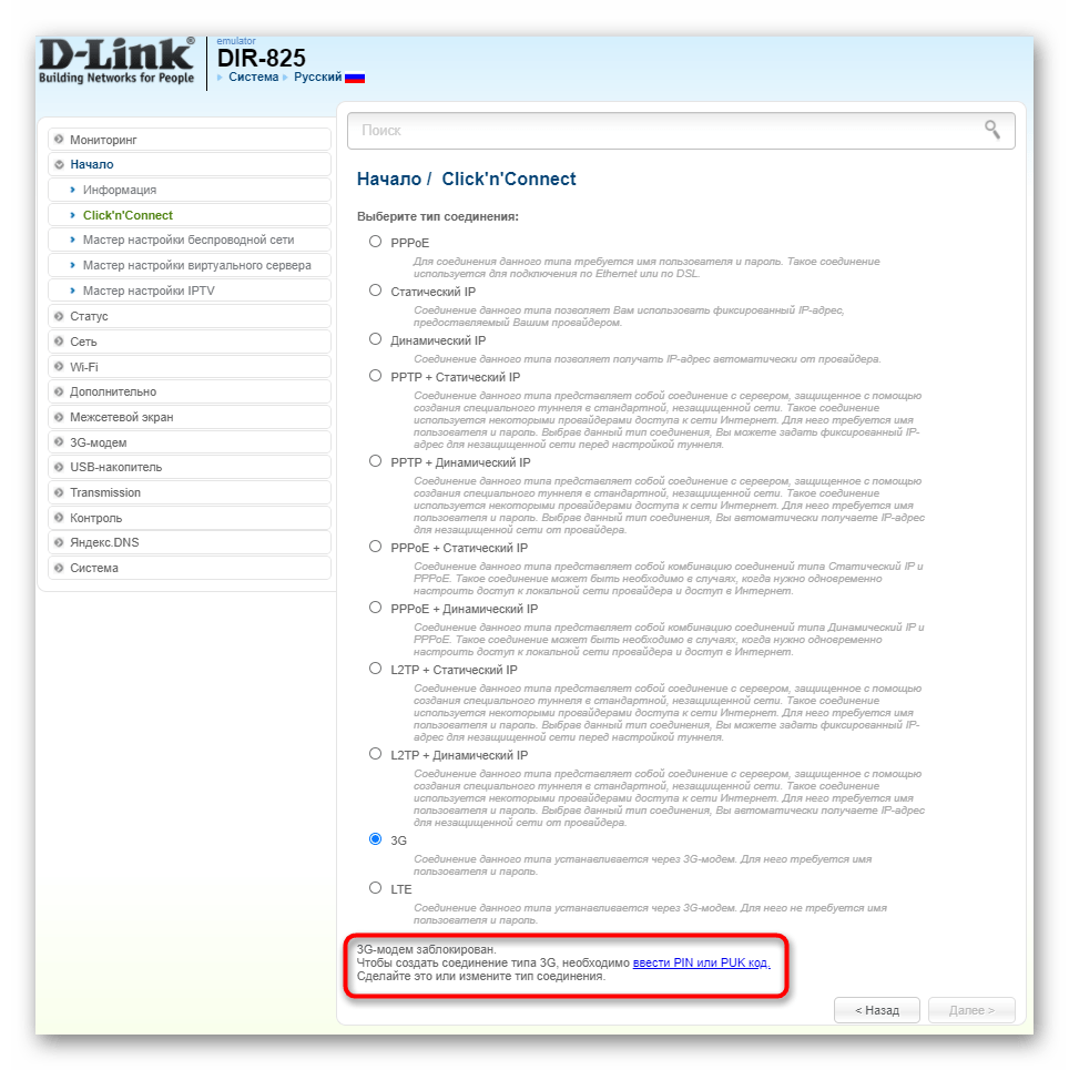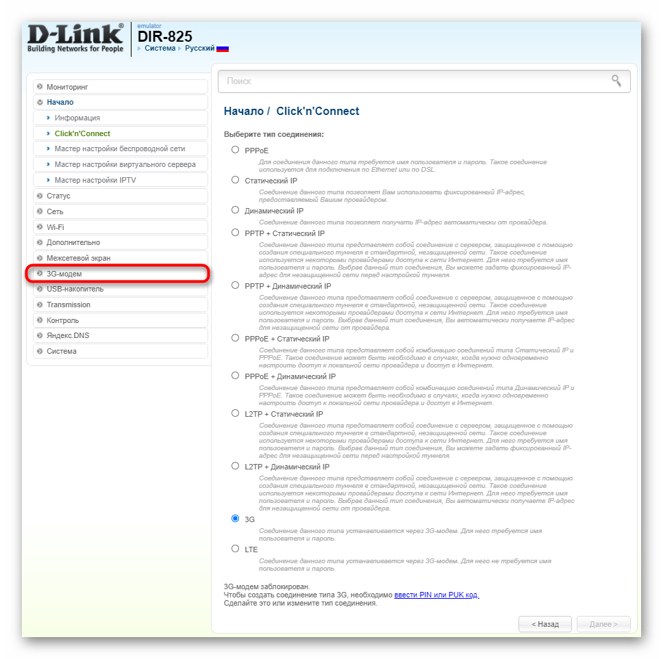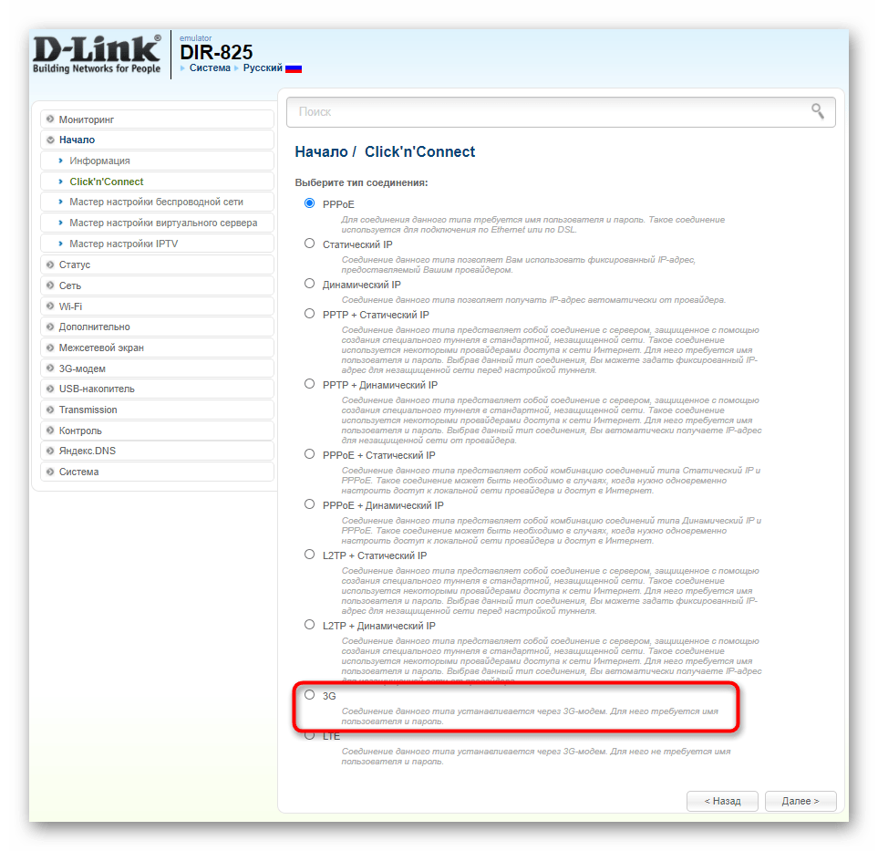 При выборе типа соединения укажите «3G» или «LTE» (4G), что зависит от того, какое поколение мобильной сети предоставляет оператор.