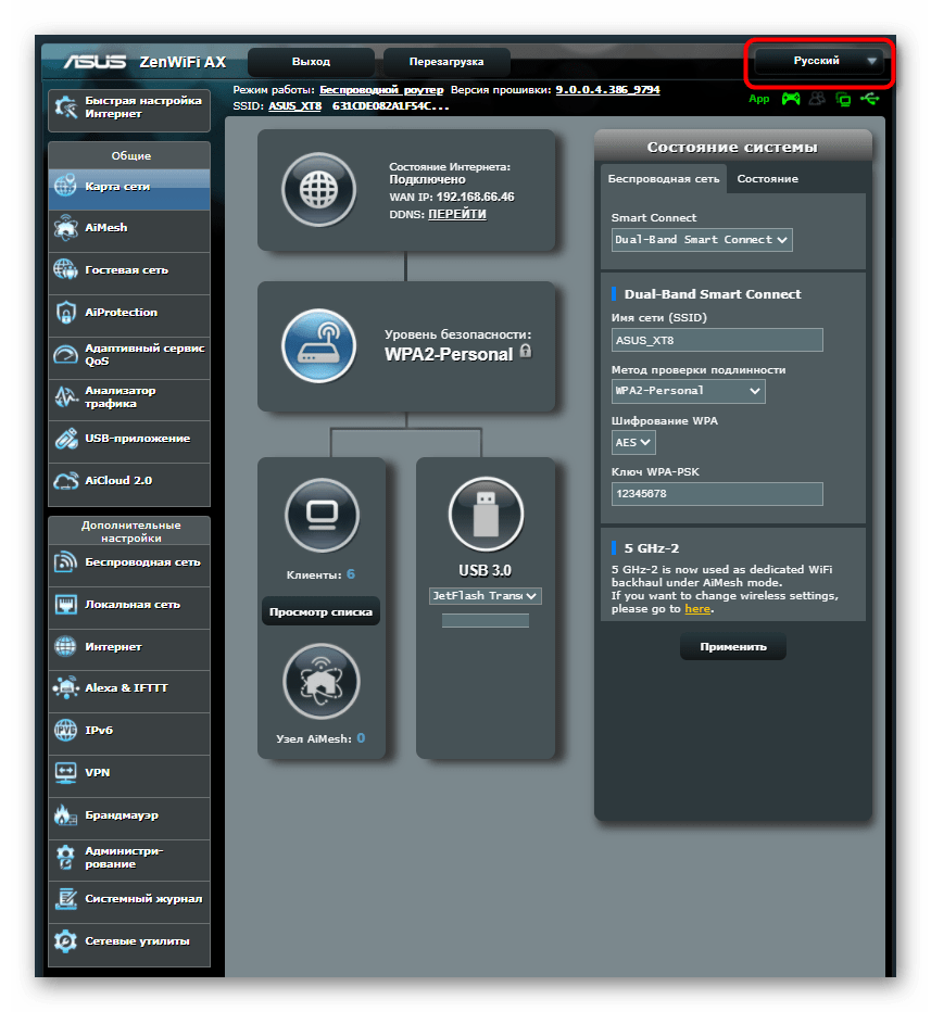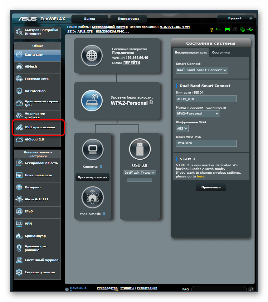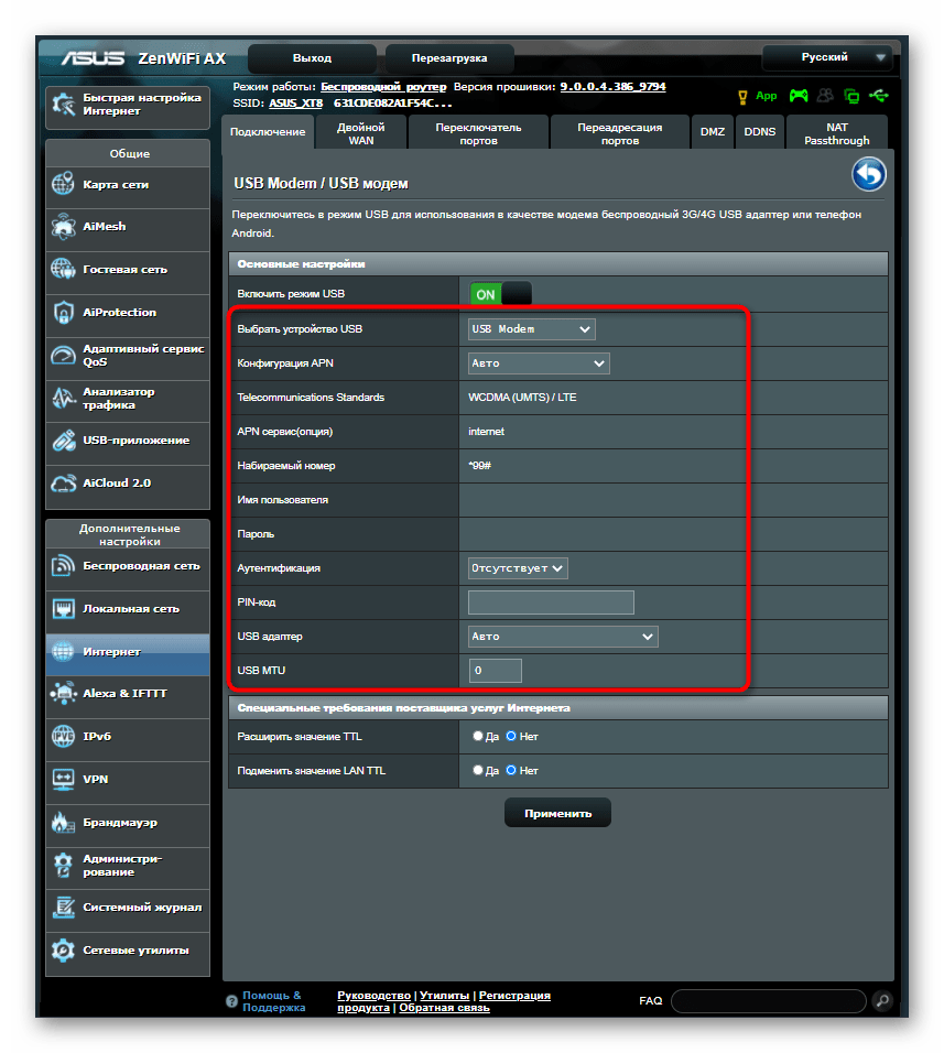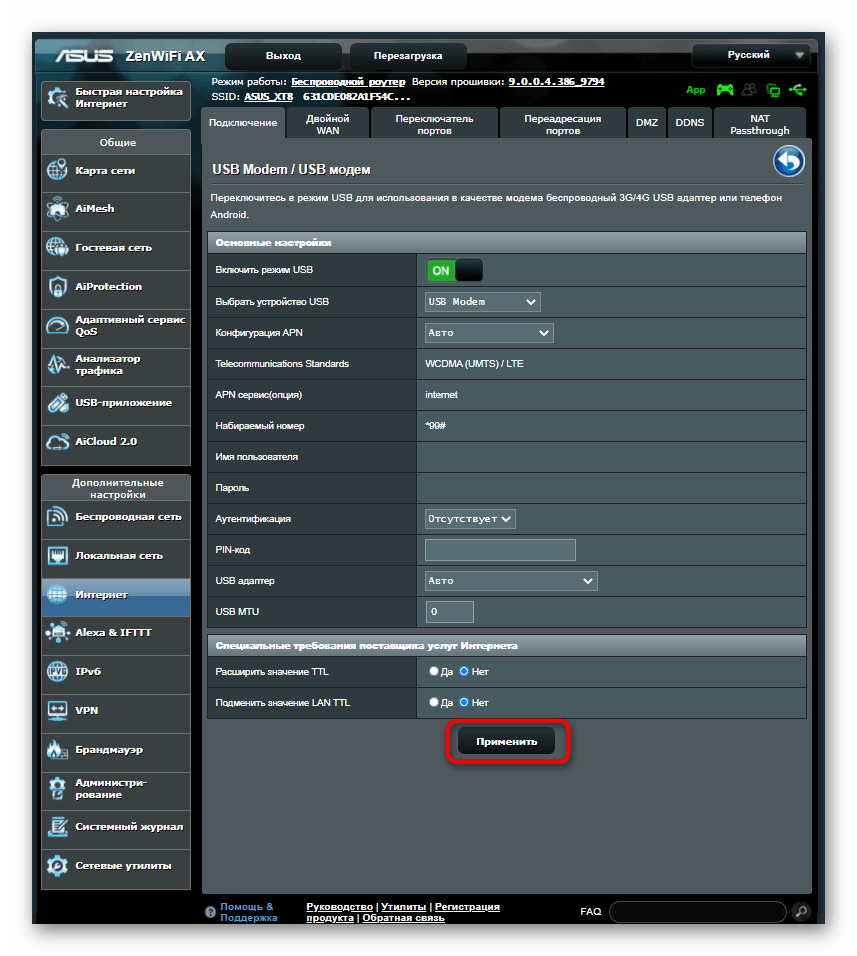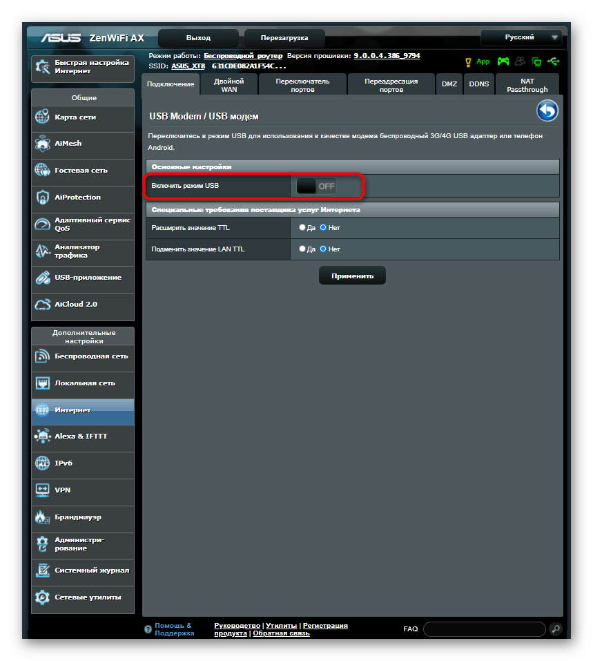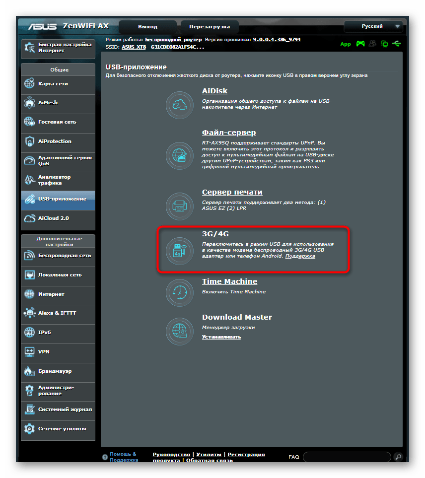 Компания ASUS решила пойти другим путем, сделав веб-интерфейс практически уникальным. Однако рассмотрим этот вариант в качестве примера не из-за индивидуальности внешнего вида, а потому что включение режима связи с USB-модемом происходит в отдельном приложении, что встречается и у других производителей сетевого оборудования.