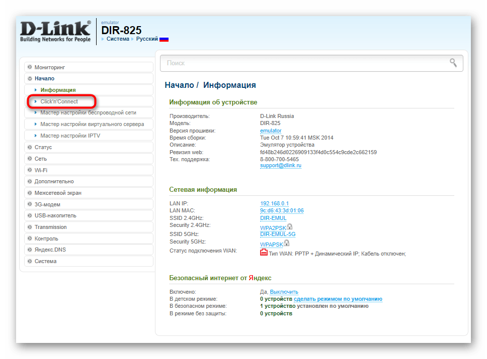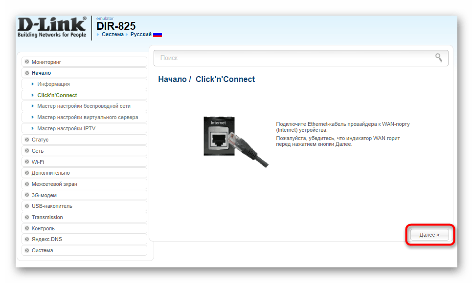 - После авторизации в интернет-центре запустите мастер настройки, нажав по разделу «Click’n’connect» или «Быстрая настройка».