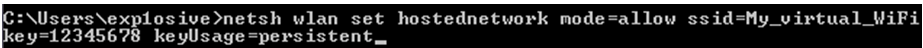 - Затем вбить специальную команду: netsh wlan set hostednetwork mode=allow ssid=user key=password и принять.
