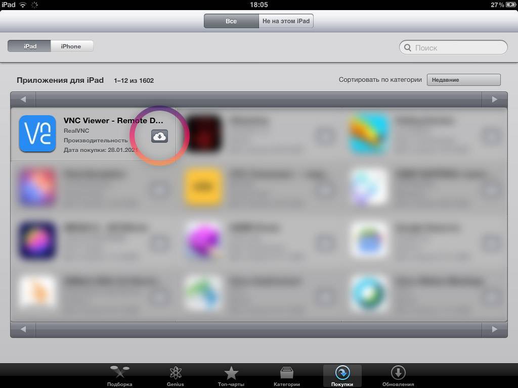 Затем берём старый iPad. Открываем на нём App Store, переходим в раздел Покупки. Нажимаем на иконку загрузки напротив VNC Viewer.